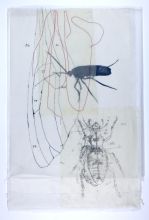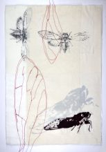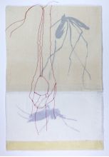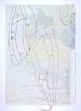 2024 | Siebdruck, Umdruck, verschiedene Stoffe und Papiere, Gaze, Fadenzeichnung, partiell gewachst, genäht | Blatt 70 x ca 50 | Objektrahmen 80 x 60